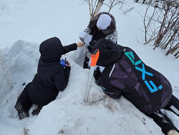 High School students conduct a snow survey on Piers Lake as part of their 10-day Winter Camp. Surveys were sent to GNWT Environment and Climate Change as part of a citizen science project.